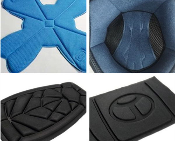 常見的海綿、EVAXPEEPP等復合材料頭盔內襯采用高周波熱合機(也叫熔斷機)加工成型。傳統加工工藝需要烤箱加壓機組合,人工需要放料到烤箱,然后取出熱料放到壓機上壓痕成型,再取出進行裁切處理。高周波熱合機可以采用熔斷模式,片料直接成型完整形狀。